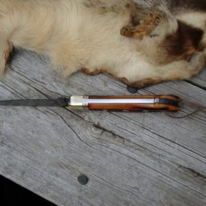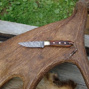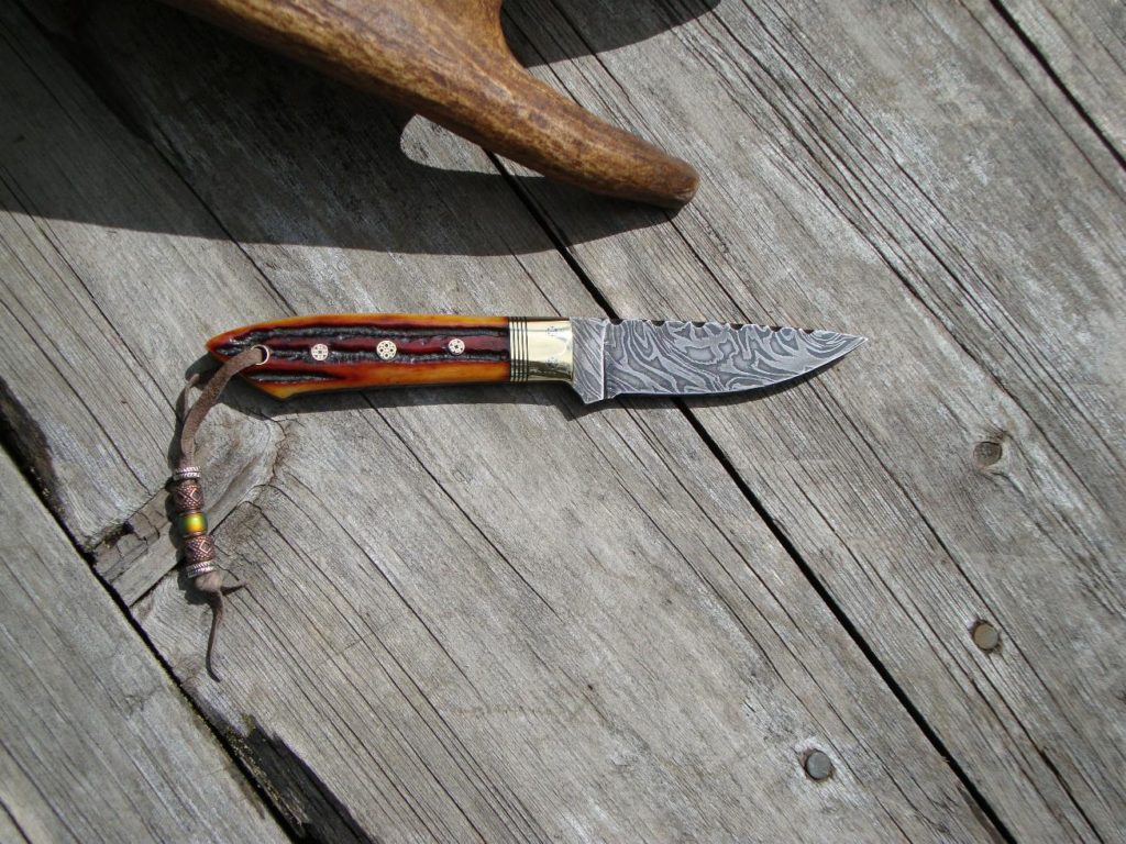 This custon bird trout knife is made by me, Mark Buzzell (MAB), right here in Maine. This great looking custom knife is 6-5/8 inches overall with a 3 inch by 1/8 inch thick 200 plus fold fire storm patern damascus steel blade. Knife blade is marked with my MAB logo as the maker of this fine knife. This knife was made from a bar stock damascus billet. The knife billets are shaped, ground, polished, oil quenced hardened and tempered to rockwell 57 to 58, then acid etched to help bring out the damascus pattern, then gun blued and given one final polish. The handle on this one is made from amber dyed stag bone with some great colors. The knife comes alive outside in the sun… The knife bolsters and spacers were made from solid brass bar stock and shaped to the handle. I also used three custom pins in the handle to add to the bone color. I also had filed the top of the blade with my “Sharp Thorn” pattern and the top of the handle in my “vine thorn” pattern. All done by hand with a chain saw file and a small triangle file. I do not use a dremel tool like some knife builders, and then call it file work. So you can see I put a lot of time just in the file work along with the fit and finish on this custom knife to make it a very collectable piece, or a good working knife. Your custom knife will come with the custom brown leather belt sheath made by Carl Thomas. Visit him at. http://www.carlthomasknifesheaths.com/ Your custom knife will also come with a black zip up knife case for storing your custom knife when it’s not in use. All my custom knives come with a hand signed COA telling more about the knife, when it was made, time spent, and so on. The one of a kind should last a good many lifetimes and would make a great gift for the knife collector that thought they had everything. $6.00 shipping by priority mail with delivery conformation and insurance. SORRY, NO INTERNATIONAL SALES