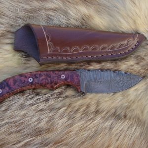 This custom Damascus hunting knife is made by me, Mark Buzzell (MAB), right here in Maine. This great looking knife is 7-1/4 inches overall with a 3-1/4 inch by just over 1/8″ inch thick and 1-1/8 inch wide and 3″ inch cutting edge, 200 plus fold Tiger Stripe pattern Damascus steel blade. The knife blade is marked with my MAB logo as the maker of this fine knife. This knife was made from a bar stock Damascus billet. The knife billets are shaped, ground, polished, oil quenched hardened and tempered to Rockwell 58, then acid etched to help bring out the Damascus pattern, then given one final polish. The handle on this one is made from rare stabilized and dyed Amboyna Burl wood with black liners, this wood has some great depth and color, your handle will come alive outside in the sun with tons of burl and colors. The knife handles are held in place with three custom copper pins made right here in the shop. I then hand filed the top of the blade with my “Double Wave” pattern. All done by hand with a chain saw file and a small triangle file. I do not use a dremel tool like some knife builders, and then call it file work, so you can see I put a lot of time just in the file work along with the fit and finish on this one to make it a very collectible piece, or a good working knife. Your custom knife will come with the custom brown leather belt sheath made by Carl Thomas of Mississippi, your knife will also come with a black zip up knife case for storing your custom knife when it’s not in use. All my custom knives come with a hand signed COA and DVD telling more about the knife, when it’s was made time spent and so on. This one of a kind should last a good many lifetimes and would make a great gift for the knife collector that thought they had everything. $6.00 shipping by priority mail with delivery conformation and insurance. SORRY NO INTERNATIONAL SALES