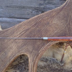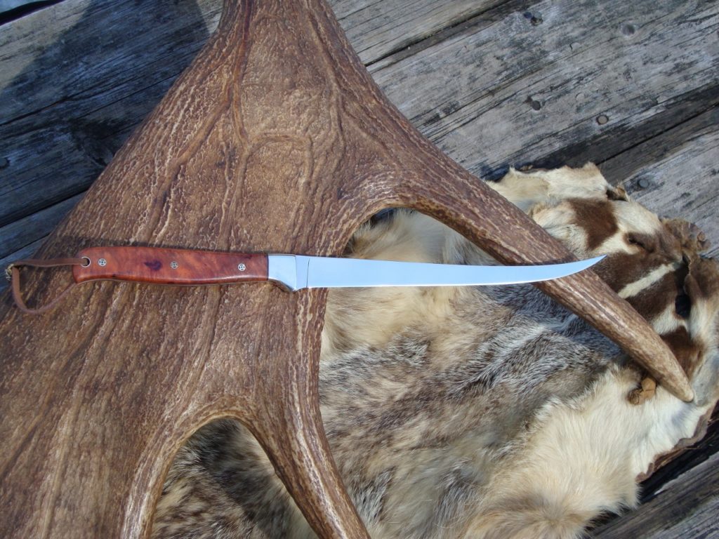 This custom fillet knife is made from 8a stainless steel blank, The knife is 12-1/8″ inches overall with a 7-1/2″ inch blade just under 1/8″ inch thick in the handle to 1/16″ inches at the end of the blade, The handles on this custom knife are made from some stabilized Lions Blood Amboyna burl wood so it will hold up to some extream use on the water. I used three custom pins in the handle for a extra touch and a set of brass bolsters to finish it off, The leather lanyard has two brass beads and one silver bead, The knife will come with the custom leather sheath made by Carl Thomas of Mississippi and a zip up knife case for storing your custom knife when its not in use, Shipping is $6.00 for priority mail with insurance and signature conformation, Sorry NO international shipping.