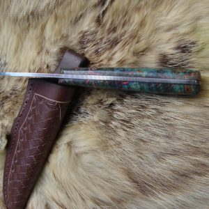 This is another custom MAB small hunting knife made from a old Nicholson file by me, Mark Buzzell (MAB), I annealed, Ground and heat treated this on right here in the shop. This custom knife is 6-3/4 inches overall with a 3″ inch carbon steel blade with a 2-3/4″ inch cutting edge, and 1/8″ thick, 1″ inch wide with a 58 Rockwell hardness. The handle is made from some great looking stabilized double dyed Black ash burl wood. The handle on this one fits perfect in your hand as well. The custom knife is a full tang construction with two custom pins. This one’s built nice and rugged so it will hold up when you’re using it in the field. The custom knife has been hand sanded from 220 to 2,000 grit for a mirror shine on the handle, the blade has a satin finish sanded at 600 grit, the top of the knife still shows the old file notches, The custom knife will come with the custom leather sheath made by Carl Thomas of Mississippi to fit your knife nice and snug. The knife will also ship with a zip up knife case for storing your custom knife when it’s not in use. All my custom knives come with a hand signed COA and DVD telling more about the custom knife, when it was made time spent and so on. This one of a kind should last a good many life times and would make a great custom knife for the person that should have the very best. Shipping inside the USA is $6.00 for priority mail with delivery conformation, insurance is included. SORRY NO INTERNATIONAL SALES