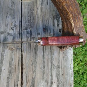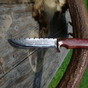 This is another custom MAB Scandi grind drop point hunting knife made from a carbon tool steel billet, Old file, By me Mark Buzzell (MAB) right here in Carmel Maine. This custom drop point knife is 8-1/2″ inches overall with a 4-3/8″ inch tool steel blade and just over 7/8″ inch wide and 1/8″ inch thick with a rockwell hardness of 59. The handle is made from some great looking stabilized flame red maple burl, Your handle will come alive outside in the sun with tons of colors.. The copper guard, spacers and pommel are all made from solid copper flat bar and sheet stock and shaped to the knife by hand. The copper spacers with the flame red maple give this one a great look to finish off this great custom knife. The handle fits just great in your hand for a snug grip as well. The knife is a rat tang construction with a corby nut in the end so it will hold up in the field if you decide to give it some use. Your custom knife has also been hand sanded from 220 grit to 1,200 grit for a mirror finish on the handle. I custom acid etched the blade in a flame grass pattern, I also hand filed the top of the blade in my “Flame” pattern to tie the flame and fire look all together. All my file work is done by hand with a round file and a half round file, Not with a dremel like some custom knife builders do and call it file worked. So as you can see I put a lot of time into every one of my custom knives from fit and finish, To file work, So each custom knife can be used in the field or saved as a collectors piece for years to come. Your knife’s custom sheath was made by Carl Thomas of mississippi. Your custom knife will ship in a zip up knife case and come with a coa and a dvd telling more about the custom knife, Time spent when it was made and so on. This one of a kind should last a good many life times. Shipping is $6.00 for priority mail with signature conformation and insurance. SORRY NO INTERNATIONAL SHIPPING