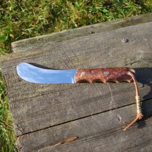 This custom MAB beaver tail skinner is made from carbon steel (Old nicholson file) Knife is 7-3/4″ inches overall with a 3-7/8″ inch blade 1″ inch wide and 1/8″ inch thick, Knife handles are made from some exhibition grade honduran rosewood burl wood with some unreal burls and swirls, I used three custom pins in the handle to add the extra touch. I handle filed the top of the handle in my “vine Thorn” Pattern, All my file work is done by hand with a round file and a half round file not with a dremil tool like some knife builders use and call file work. Knife was hand sanded from 220 grit to 2,000 grit then put on the buffer wheel for a final shine. Knife comes with the custom leather sheath made by Carl Thomas of Mississippi. I put alot of time into fit and finishand file work to make every knife a collectors piece or for a everyday use knife, all my knives come with a 100% satisfaction gurantee if your not happy just send it back for a full refund including your return shipping cost. Great knife for any hunter to have on his side out in the field or to just put in there collection. SORRY NO INTERNATIONAL SALES. Shipping is $6.00 priority mail with insurance and signature conformation.