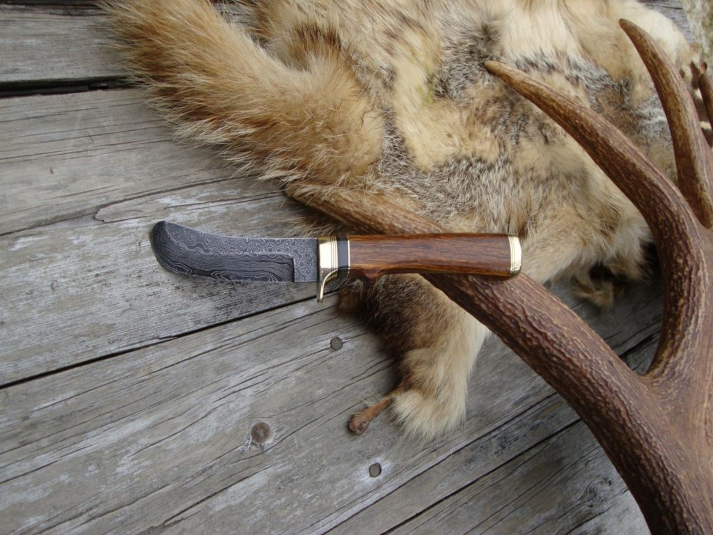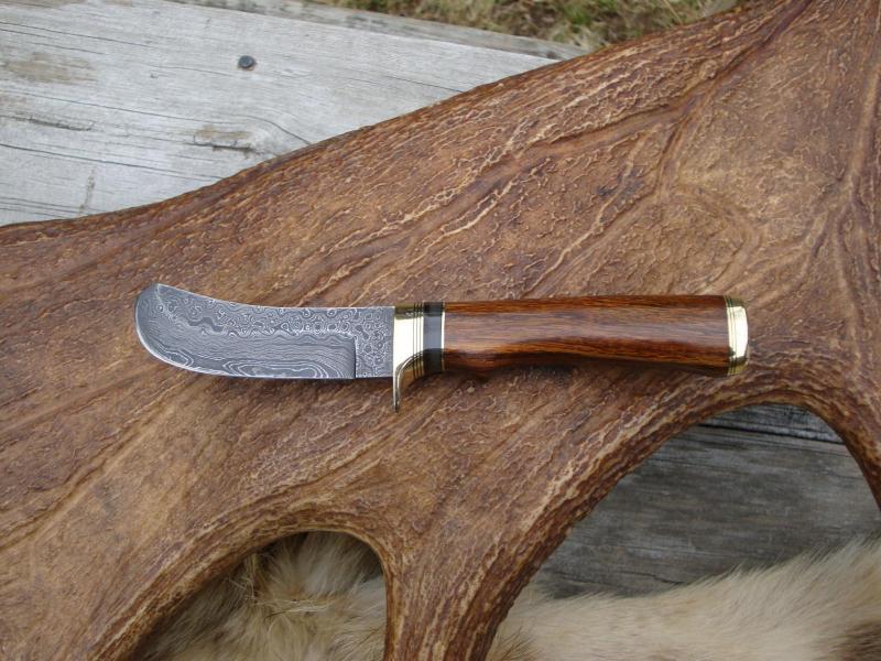 This beaver tail skinner has a dark random wave damascus blade, on the handle of this one I used a piece of arazona desert iron wood and in the front of the wood i used some recon tortoise shell stone to match the iron wood with some brass and some black spacers by the brass guard and pommel area as well. This one just melts in your hand with it’s fit and finish. The knife is 7-3/4 inches overall with a 3-3/8 inch blade to the guard making for a 2-7/8 inch cutting edge, Blade is 3/16 thick and just under 1 inch wide. This knife was made from a bar stock 400 plus fold random wave pattern damascus billet. The knife billet was shaped, ground, polished, oil quenced hardened and tempered to rockwell 57 to 58, then acid etched to help bring out the damascus pattern, Then gun blued and given one final polish. Knife is a rat tang construction with a corby nut in the end so it will hold up if you decide to give it some use in the field. And i’m sure this would make one heck of a skinning knife. The custom sheath was made by Carl Thomas of Mississippi. Your knife will come with a hand signed coa telling more about the knife and a dvd showing you around the shop. Knife will ship in a custom zip up storage case also. Shipping is $6.00 for priority shipping with insurance and signature conformation. SORRY NO INTERNATIONAL SALES