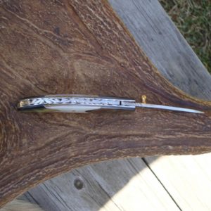 This custom posket knife has white mother of peal with black lip mother of pearl on the handles with a gem stone thumb stud, Custom pins in the handle as well, Hand file work on the top and more file work on the lock and liners. Knife is 6-1/4″ inches whn open and has a 2-3/4″ inch blade, Razor sharp, Knife is 3-7/8″ inches closed, Knife will ship with zip up storage case, Knife blade is marked with a large letter B as the makers mark, Wish I knew the makers name on these, This is another one from my privite collection, If your looking for a custom pocket knife this one should fit the bill. SORRY NO INTERNATIONAL SALES