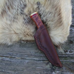 This custom MAB Damascus Bird Trout style hunting knife is made by me, Mark Buzzell (MAB), right here in Maine. This great looking knife is 7-1/8 inches overall with a 3-1/4 inch by 3/16″ inch thick 7/8″ inch wide and is a 200 plus fold Random Rain Drop pattern Damascus steel False Grind point blade with a 3/4 false grind on the top to give a a little more class. Knife blade is marked with my MAB logo as the maker of this fine knife. This knife was made flat a bar stock Damascus billet. The knife billets are shaped, ground, polished, oil quenched hardened and tempered to Rockwell 58, then acid etched and then gun blued to help bring out the Damascus pattern and given one final polish, all done by me. The handle on this one is made from stabilized Australian Red Malle Burl Wood with a Pair of Red Jasper True stone Spacers, what a handle this stuff makes. The knife guard and spacers were made from solid brass sheet and bar stock, I took the time to hand file, the top of the blade with my “Thorn” pattern, All done by hand with a chain saw file and a small triangle file. I do not use a dremel tool like some knife builders, and then call it file work, so you can see I put a lot of time just in the file work on this one to make it a very collectible piece, or a good working custom knife that will only gain in value as time goes by. Your custom knife will come with the custom brown leather belt sheath made by Carl Thomas, your knife will also come with a black zip up knife case for storing your custom knife when it’s not in use. All my custom knives come with a hand signed COA and DVD telling more about the knife, when it’s was made time spent and so on. This one of a kind should last a good many lifetimes and would make a great gift for the knife collector that thought they had everything. $6.00 shipping by priority mail with delivery conformation and insurance. SORRY NO INTERNATIONAL SALES