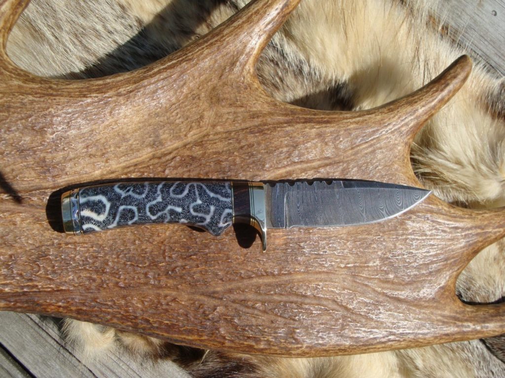 This custon hunting knife is made by me, Mark Buzzell (MAB), right here in Maine. This great looking knife is 8-1/8 inches overall with a 4-1/8 inch blabe with a 3-3/8″ inch cutting edge by 3/16 inch thick and 1- 1/16″ inch wide, The damascus use is a 200 plus twist pattern damascus steel. The Knife blade is marked with my MAB logo as the maker of this fine knife. This knife was made from a bar stock Damascus billet. The knife billets are shaped, ground, polished, oil quenced hardened and tempered to rockwell 57 to 58, then acid etched to help bring out the damascus pattern, Then gun blued and given one final polish. The handle on this one is made from Exhibition grade stabilized African black wood and stabilized fossil coral. The fossil coral used is collected from oceans around the world and will date from 15,000 to 20,000 years old and puts a little weight into the knife, Very few knife makers will work with fossil coral because of the amount of time it takes to get the coral voids filled and sanded smooth even after the stabilizing processes, The handle was sanded to 1,200 grit to give it a glass finish. The knife will come alive outside in the sun… The knife guard, spacers, and pommel were made from solid brass and aluminum bar and sheet stock and shaped to the handle by hand. I also had filed the top of the blade with my “vine” pattern. And the handle spacer in my “walking lizard” pattern, All done by hand with a chain saw file and a small triangle file. I do not use a dremel tool like some knife builders, and then call it file work. So you can see I put a lot of time just in the file work along with the fit and finish on this one to make it a very collectable piece, or a good working knife. Your knife will come with the custom brown leather belt sheath made by Carl Thomas. Your knife will also come with a black zip up knife case for storing your custom knife when it’s not in use. All my custom knives come with a hand signed COA and dvd telling more about the knife, when it was made, time spent, and so on. This one of a kind should last a good many lifetimes and would make a great gift for the knife collector that thought they had everything. $6.00 shipping by priority mail with delivery conformation and insurance. SORRY, NO INTERNATIONAL SALES