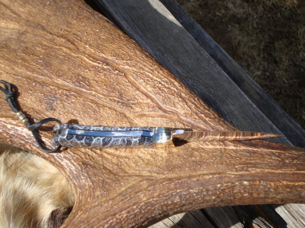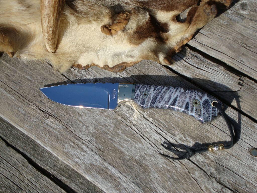 This custom knife is a MAB drop point Style knife, This one has it all, The custom knife is made from S30V stainless steel, The knife was hand ground from bar stock, The blade was done in a soft hollow grind style, Then polished, oil quenched hardened And tempered to a Rockwell hardness of 60. The handle on this one is made from stabilized fossil coral. The fossil coral is found in oceans around the world and will date to 15,000 to 20,000 years old or more. This type of coral make for such a great looking handle and it’s a real eye catcher. I also used two custom hollow pins in the handle and two custom pins in the guards to give it a little extra. The knife is 7-3/4″ inches overall with a 3-1/2″ inch blade with a 3-1/8″ inch cutting edge, and 1-1/8″ inches wide and a rugged Heavy just under 3/16″ inch thick, The custom brass guard and spacers are made from sheet and bar stock and shaped by hand to the knife for a perfect fit and finish. I then put some file work to make this a real custom knife, The file work I used on this one is my “Walking Lizard” pattern going down the blade, And my “Double Wave” pattern on the handle. All my file work is done by hand with a chainsaw file and a half round file, “Not” with a dremel tool like some knife builders call file work. The custom knife was hand sanded from 220 grit to 2,000 grit to put a mirror finish on the blade and handle then put on the buffing wheel for a final shine, The custom knife sheath was made by Carl Thomas of Mississippi to make for a perfect fit, So as you can see I put a lot of time into this custom knife from the fit and finish to the file work to make this a collectors investment piece or a everyday user to pass down to future generations to enjoy, This one will be the knife to enjoy the top spot in your knife collection. All my custom knives come with a hand signed COA and a DVD telling more about the knife and shop. Knife will ship priority mail with insurance and signature conformation for a flat rate of $6.00 sorry no international shipping