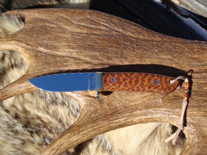 This custom knife is a MAB Loveless style drop point knife, This one has it all, The custom knife is a true tapered tang made from S30V stainless steel, The knife was hand ground from bar stock, Then polished, oil quenched hardened And tempered to a Rockwell hardness of 59. The handle on this custom knife is made from Exhibition grade Snakewood. I also used three custom pins, one brass and two copper and brass pins in the handle to match the Snakewood colors. The knife is 8-1/4″ inches overall with a 3-7/8″ inch blade with a 3-1/2″ inch cutting edge, and 1-1/8″ inches wide and a rugged 3/16″ inch thick, The custom knife handle tapers down to 1/16″ inch thick making for a great look, The custom brass guard and spacers are made from sheet and bar stock and shaped by hand to the knife for a perfect fit and finish. I then put some file work to make this a real custom knife, The file works starts with my “Barb Wire” pattern going down the blade and my “Walking Lizard” pattern going the hole way down the tapered handle. All my file work is done by hand with a chainsaw file and a half round file, “Not” with a dremel tool like some knife builders call file work. The custom knife was hand sanded from 220 grit to 2,000 grit to put a mirror finish on the blade and handle then put on the buffing wheel for a final shine, The custom knife sheath was made by Carl Thomas of Mississippi to make for a perfect fit, So as you can see I put a lot of time into this custom knife from the fit and finish to the file work to make this a collectors investment piece or a everyday user to pass down to future generations to enjoy, This one will be the knife to enjoy the top spot in your knife collection. All my custom knives come with a hand signed COA and a DVD telling more about the knife and shop. Knife will ship priority mail with insurance and signature conformation for a flat rate of $6.00 sorry no international shipping
