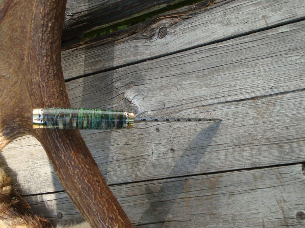 This custom medium size hnting knife is made by me, Mark Buzzell (MAB), right here in Maine. This great looking knife is 7-3/4 inches overall with a 3-7/8 inch blade wiht a 3-1/2″ inch cutting edge, by 1/8 inch thick 200 plus fold twist pattern damascus steel blade. The knife blade is marked with my MAB logo as the maker of this fine knife. This knife was made from a bar stock damascus billet. The knife billets are shaped, ground, polished, oil quenched hardened and tempered to rockwell 57 to 58, then acid etched to help bring out the damascus pattern, then gun blued and given one final polish. The handle on this one is made from dyed stabilized Mammoth tooth fossil with some great colors, the Mammoth tooth used is from the permafrost pleistocene era, making the fossil tooth average to be 30,000 to 50,000 years old. Your handle comes alive outside in the sun tons of colors. Knife is a rat tang constcution with a corby nut in the end so it will hold up in the field if you decide to give it some use. The knife guard, spacers and pommel were made from solid brass bar stock and shaped to the handle, The two file worked spacers are made from aircraft aluminum and file in my vine pattern, I then hand filed the top of the blade with my new “Barb Wire” pattern… all done by hand with a chain saw file and a small triangle file. I do not use a dremel tool like some knife builders, and then call it file work, so you can see I put a lot of time just in the file work along with the fit and finish on this one to make it a very collectible piece, or a good working knife. Your knife will come with the custom brown leather belt sheath made by Carl Thomas, your knife will also come with a black zip up knife case for storing your custom knife when it's not in use. All my custom knives come with a hand signed COA and dvd telling more about the knife, when it's was made time spent and so on. This one of a kind should last a good many life times and would make a great gift for the knife collector that thought they had everything. $6.00 shipping by priority mail with delivery conformation and insurance. SORRY NO INTERNATIONAL SALES