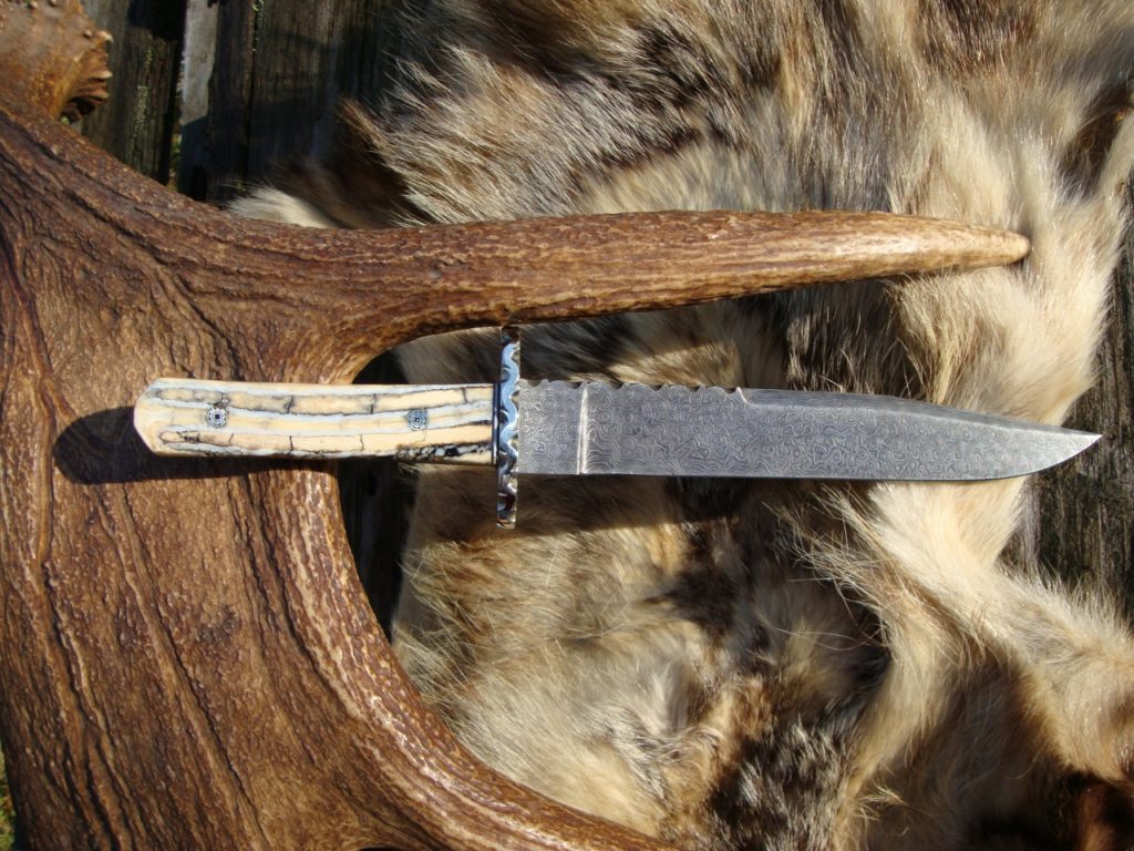 This Custom bowie knife was one a made over 10 years ago and have had it in my personal collection all this time, Now it’s time to let someone else enjoy this great looking knife. This knife was made from a 400 plus fold bar stock damascus billet. The knife billets are shaped, ground, polished, oil quenced hardened and tempered to rockwell 58, then acid etched to help bring out the damascus pattern, then gun blued and given one final polish. Knife is 12-7/8″ inches over all with a 8″ inch blade with a 7-1/4″ inch cutting edge, 1-1/4″ inch wide and3/16″ inch thick. This custom bowie knife has it all, Exhibition grade Mammoth tooth fossil And lots of custom file work. I put a solid brass guard on this one with lots of file work done in my “vine” Pattern to match the handle and blade file work, The top of the blade has been hand filed in my “Vine” pattern and the handle as well. The mammoth tooth used is from the perma frost area in Siberia Russia and it will date from 30,000 to 50,000 years old, It has been deep stabilized and lightly dyed for a one of a kind look, This blade has a false grind for over half of the top and it is also a tapered tang as well, The damascus used was a 400 plus fold random wave pattern this one is an oldie but a goodie, I hate to see it go but it’s time. great looking bowie made in some of my first years as a knife maker, so it’s not perfect but pretty darn close. The custom bowie will come with the custom sheath and a custom zip up knife case to store your knife in, all my custom knives come with a hand signed coa and dvd telling more about the knife as well. Shipping is $6.00 for priority mail with insurance and signature conformation.. SORRY NO INTERNATIONAL SALES