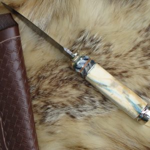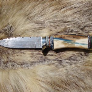 This great looking drop point hunting knife is made with a piece of Robert Calcinore mosaic Damascus composed of 1095,1080, O1, Mild steel and nickel steel, Robert makes some of the best stuff on the market and you can see why it sells out fast when you see how nice a blade this stuff makes, The billet was hand ground, polished acid etched oil quenched hardened and tempered to a Rockwell of 56 to 57 a blade with this many steels in the mix will not have a Rockwell the complete length of the cutting edge as some of the softer steels will meet at the edge causing a softer cutting edge, whats all this mean, You may have to touch up the cutting edge if your giving it some use in the field, That’s all, Back to the knife, this one is 8-7/16″ inches overall with a 4-3/16″ inch blade by 1″ inch wide and 1/8″ inch thick. The handle on this one is made from some great looking stabilized mammoth ivory mixed with resin and Mammoth Tooth Spacers, The ivory and Tooth will date from 15,000 to 20,000 thousand years old and was found in the permafrost area of Siberia Russia,, The knife is a rat tang construction with a Corby nut in the end, the handle also has a solid nickel guard and pommel with Nickel, aluminum and copper spacers all made from flat bar and sheet stock and shaped by hand to the knife, I also hand filed the top of the blade in my “Triple Wave” pattern for the extra look, and the handle spacer in my “vine Thorn” Pattern. all my file work is done by hand with a chain saw file and a half round file, so you can see I put a lot of time into every knife for fit and finish to make them a collectible piece of art or something to take out in the field and give it some use, all my knives will last many lifetimes and can be enjoyed for many generation to come, knife comes with the custom knife sheath made by Carl Thomas of Mississippi, Your custom knife will ship in a knife storage case for when your custom knife is not in use, Shipping is $6.00 for priority mail with insurance. Sorry No International Shipping.