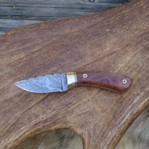 This custom small Damascus hunter is made by me, Mark Buzzell (MAB), right here in Maine. This great looking custom knife is 5-3/8 inches overall with a 2-3/8 inch blade, By just under 3/16 inch thick and 7/8″ inch wide 200 plus fold tiger stripe patern damascus steel blade. Knife is a full tang construction so it will hold up in the field if you decide to give it some use. The Knife blade is marked with my MAB logo as the maker of this fine custom knife. This knife was made from a bar stock damascus billet. The knife billets are shaped, ground, polished, oil quenced hardened and tempered to rockwell 57 to 58, then acid etched to help bring out the damascus pattern, then gun blued and given one final polish. The handle on this one is made from stabilized Australian red malle burl wood with some great color and burl, The knife comes alive outside in the sun.. I used two custom brass pins in the handle and two custom copper pins in the brass guards, all made right here in the shop, The brass used in the guards and the spacers is made from bar and sheet stock and shaped by hand to the knife. I also hand filed the top of the blade in my “Barb Wire” pattern, All done by hand with a chain saw file and a small triangle file. I do not use a dremel tool like some knife builders, and then call it file work. So you can see I put a lot of time in the file work along with the fit and finish on this one to make it a very collectable piece, or a good working knife. Your knife will come with the custom brown leather belt sheath made by Carl Thomas of Mississippi. Your custom knife will also come with a black zip up knife case for storing your custom knife when it’s not in use. All my custom knives come with a hand signed COA and dvd telling more about the knife, a look around the shop, time spent, and so on. This one of a kind should last a good many lifetimes and would make a great gift for the knife collector that thought they had everything. $6.00 shipping by priority mail with delivery conformation and insurance. SORRY, NO INTERNATIONAL SALES