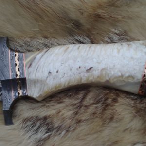 This Bowie Knife was made from a billet of 200 fold fire storm Damascus and was ground to the shape you see, the knife was heat treated, quenched, tempered than acid etched to bring out the Damascus pattern, the Rockwell on this one is right at 58 for hardness, blade is 8-1/8″ inches long by 1-3/4″ inches at the wide point, handle is 5-1/2″ inches from front of guard to longest point of pommel, all the fittings are made from flat bar stock Damascus, Brass for the file worked spacers and copper liners on each side, The handle is Musk Ox horn with Resin dyed to match the horn, all the fittings where made by me here in the shop, even the little Damascus handle take down tool, there is no glue in this knife so by taking the little take down tool and removing the Damascus pommel nut the whole knife can come apart, all pieces are numbered to help reassemble the knife, than just snug the pommel nut back down and the knife is complete, I did hand file work on the brass spacers in my sharp thorn pattern and the top of the blade in my Bat Wing pattern, doing a take down knife of any kind takes lots of planning to get things right, the leather sheath was made in the shop as well to fit nice and tight to the knife, so as you can see there is a lot of work that went into this Bowie to make it a true one of a kind, all done by hand with no fancy machines, Knife will come with a thumb Drive COA telling more about the knife and a custom knife zip up storage pouch for keeping your custom Bowie knife safe.